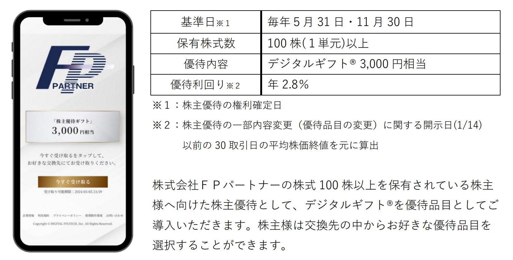 株式会社FPパートナー(代表取締役社長:黒木 勉、東証プライム:証券コード 7388)において、株式会社デジタルプラス(代表取締役社長:菊池 誠晃、本社:東京都渋谷区、東証グロース市場:証券コード3691)グループが運営する「デジタルギフト®︎」を株主優待としてご活用いただくことになりました。