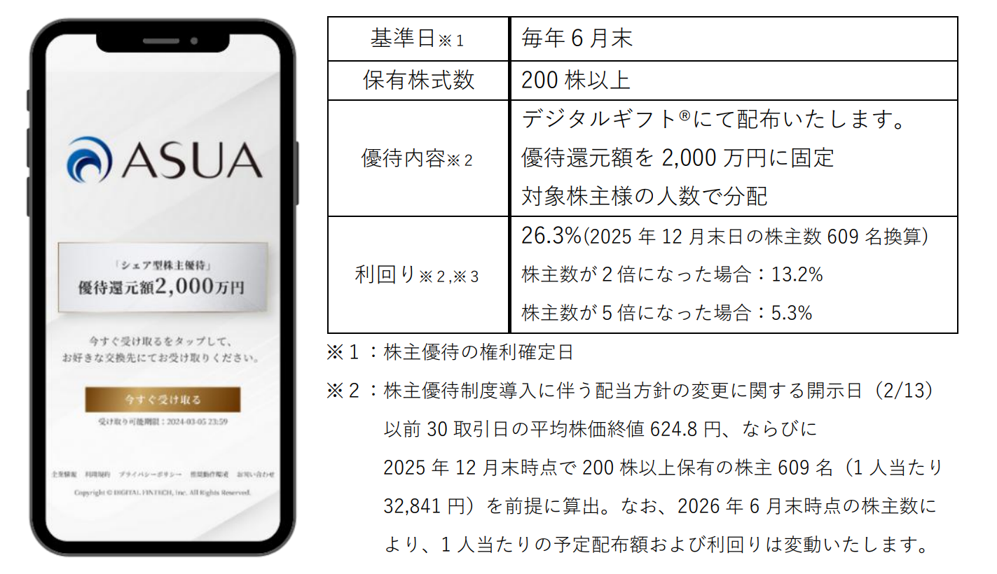 株式会社アスア(代表取締役社長:間地 寛、東証グロース:証券コード 246A)において、株式会社デジタルプラス(代表取締役社長:菊池 誠晃、本社:東京都渋谷区、東証グロース市場:証券コード3691)グループが運営する「デジタルギフト®︎」を活用し、優待還元額を固定できる新しい仕組み「シェア型株主優待」をご活用いただくことになりました。