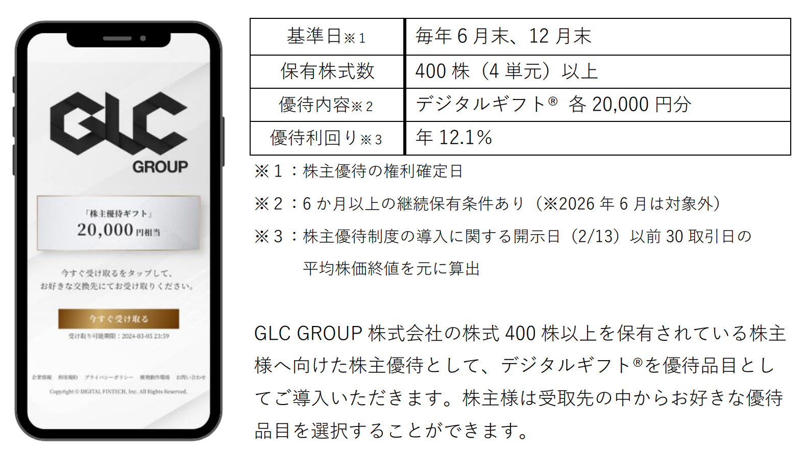 GLC GROUP株式会社(代表取締役社長:髙村 隼人、東証スタンダード:証券コード 2970)において、株式会社デジタルプラス(代表取締役社長:菊池 誠晃、本社:東京都渋谷区、東証グロース市場:証券コード3691)グループが運営する「デジタルギフト®︎」を株主優待としてご活用いただくことになりました。