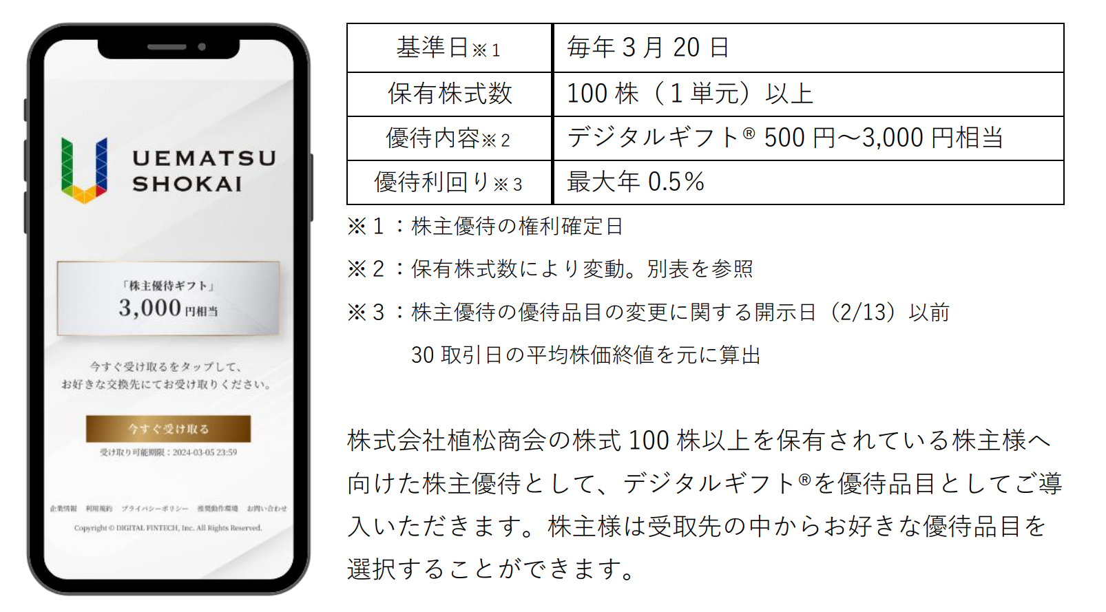 株式会社植松商会(代表取締役社長:植松 誠一郎、東証スタンダード・名証メイン:証券コード 9914)において、株式会社デジタルプラス(代表取締役社長:菊池 誠晃、本社:東京都渋谷区、東証グロース市場:証券コード3691)グループが運営する「デジタルギフト®︎」を株主優待としてご活用いただくことになりました。