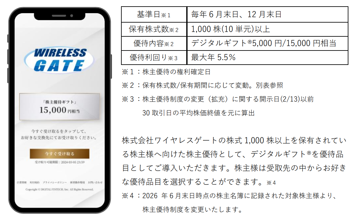 株式会社ワイヤレスゲート(代表取締役CEO:成田 徹、東証スタンダード:証券コード 9419)において、株式会社デジタルプラス(代表取締役社長:菊池 誠晃、本社:東京都渋谷区、東証グロース市場:証券コード3691)グループが運営する「デジタルギフト®︎」を株主優待としてご活用いただくことになりました。