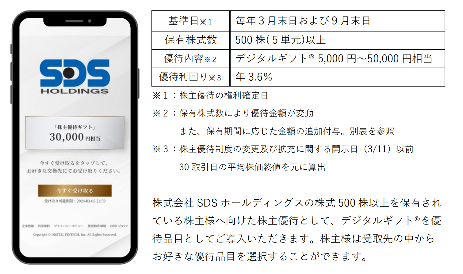 株式会社SDSホールディングス(代表取締役社長:渡辺 悠介、東証スタンダード:証券コード 1711)において、株式会社デジタルプラス(代表取締役社長:菊池 誠晃、本社:東京都渋谷区、東証グロース市場:証券コード3691)グループが運営する「デジタルギフト®︎」を株主優待としてご活用いただくことになりました。